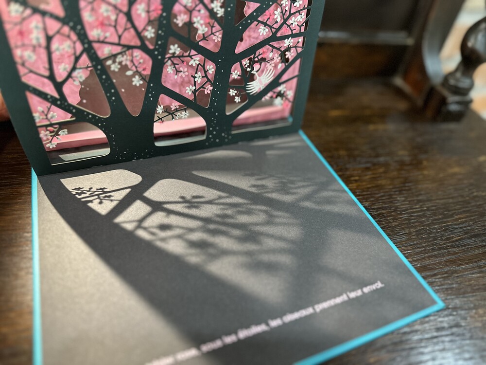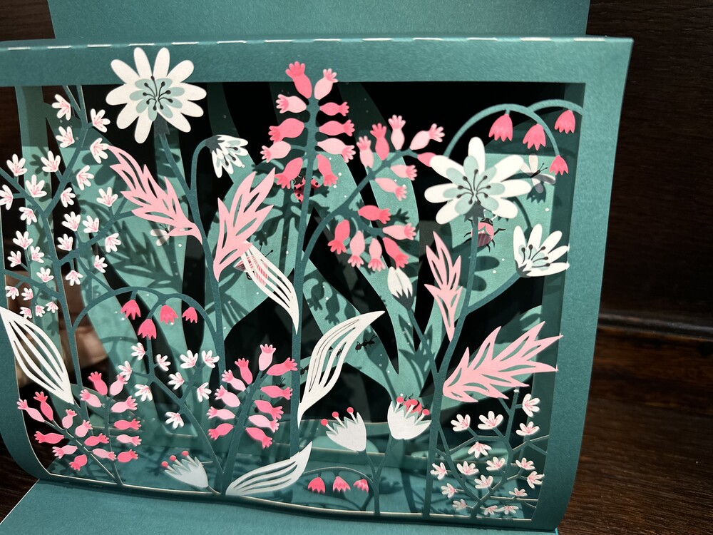 아침 이슬에 날개 두 개가 푸들푸들 떨립니다. 정원이 비를 맞으며 새싹이 파릇파릇 싹이 트고, 연못에 그림자가 드리워집니다. 저녁 무렵이면 은은한 꽃향기가 가득합니다. 별빛 아래 분홍빛 벚나무에는 새들이 날아듭니다. 자연을 관찰하는산책하는 한장한장 보시면 되는 작품입니다. 5개의 팝업으로 정교하게 페이퍼컷팅이 되어있습니다.