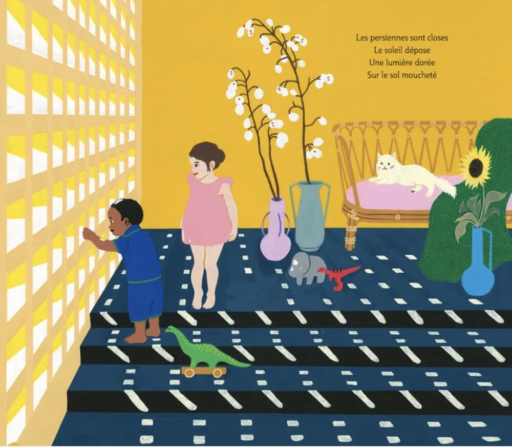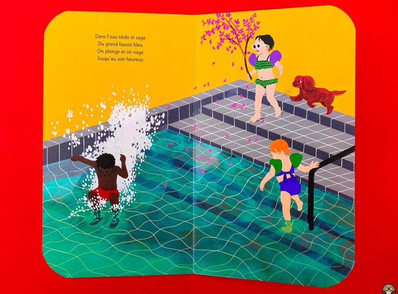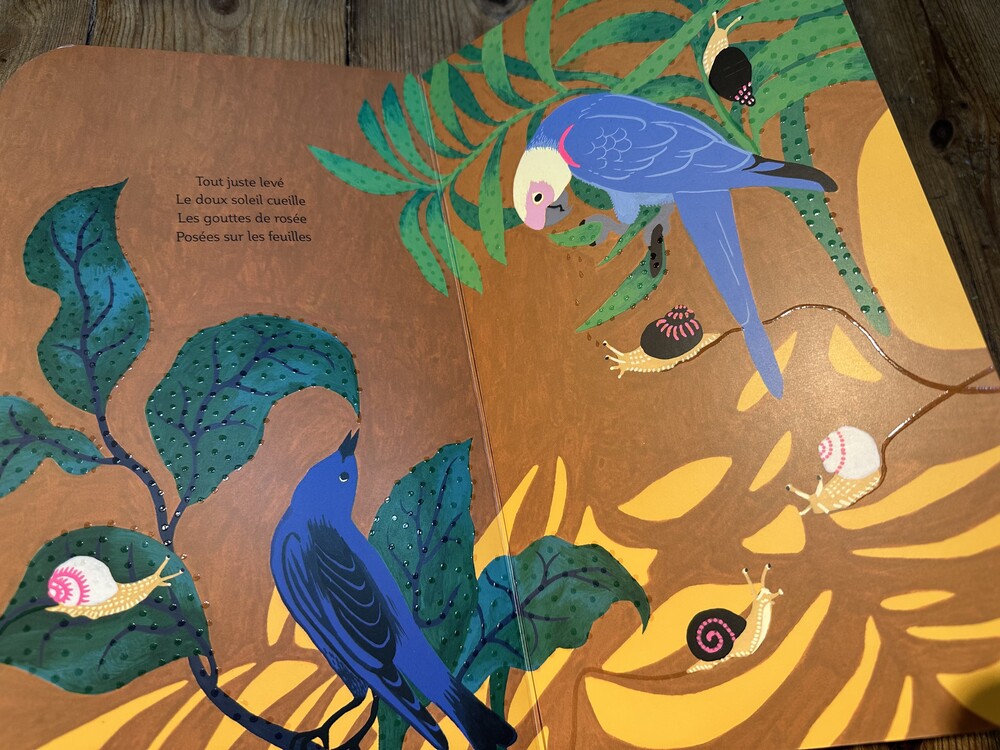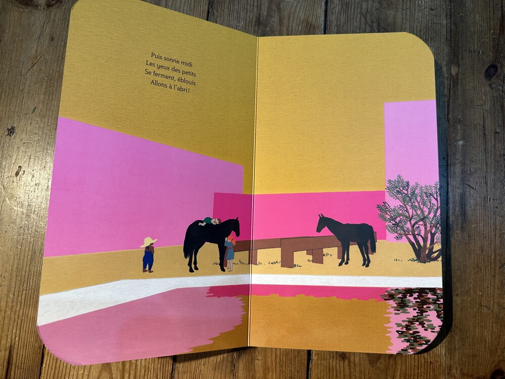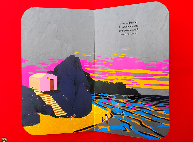 어린 아이들이 따라다니며 만질 수 있는 반짝이는 요소(아침이슬, 태양광선, 그림자, 물에 비친 반사, 지는 석양)가 아름답게 표현되어 있습니다. 형광 핑크색이 여기저기 섞여 있고, 손으로 만지는 촉감도 다채롭습니다.