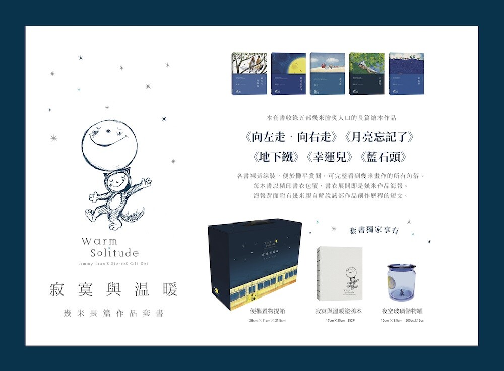 많은 사랑을 받은 지미 작가의 장편 그림책 다섯 편으로 엮은 작품 세트입니다. 그는 독창적인 이미지와 시적인 문장을 통해, 외로움을 품고 있지만 마음을 따뜻하게 어루만지는 이야기들을 들려줍니다. 흐르는 색채, 교차하는 선, 그리고 이미지와 글의 조화는 작가의 삶의 태도를 보여줄 뿐 아니라, 말로 표현하기 어려운 위로의 감정을 전합니다.