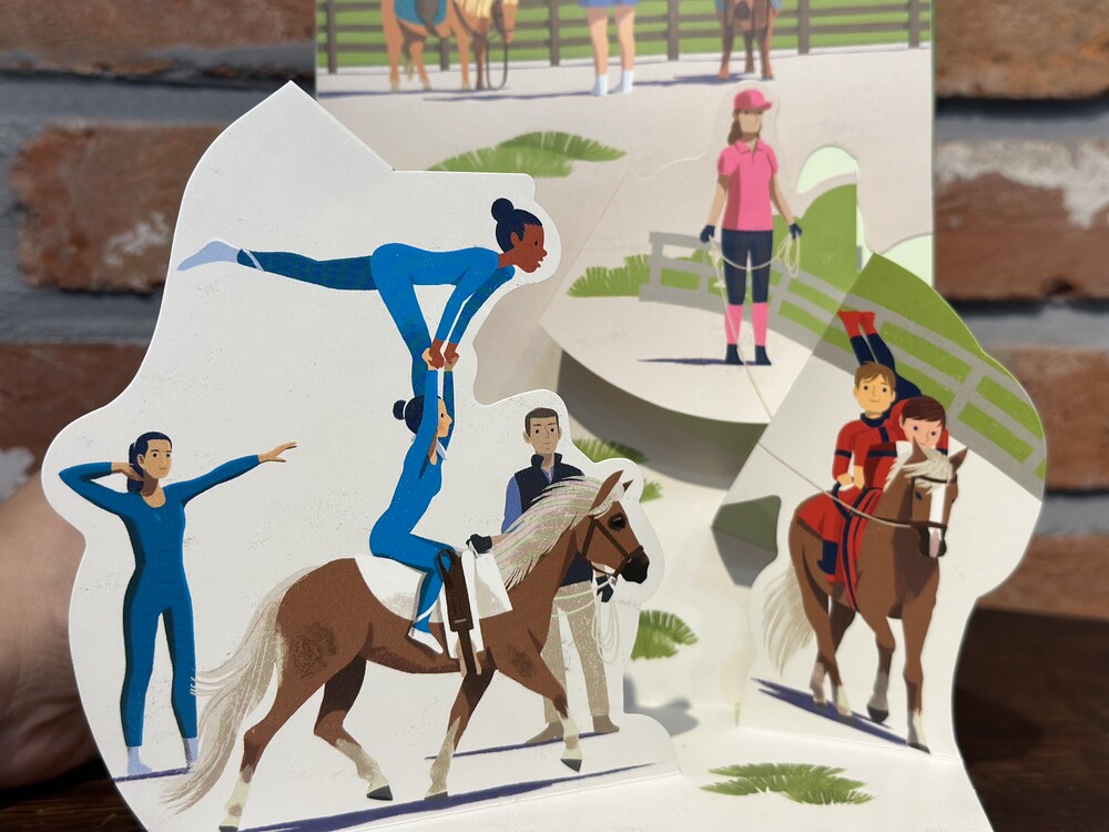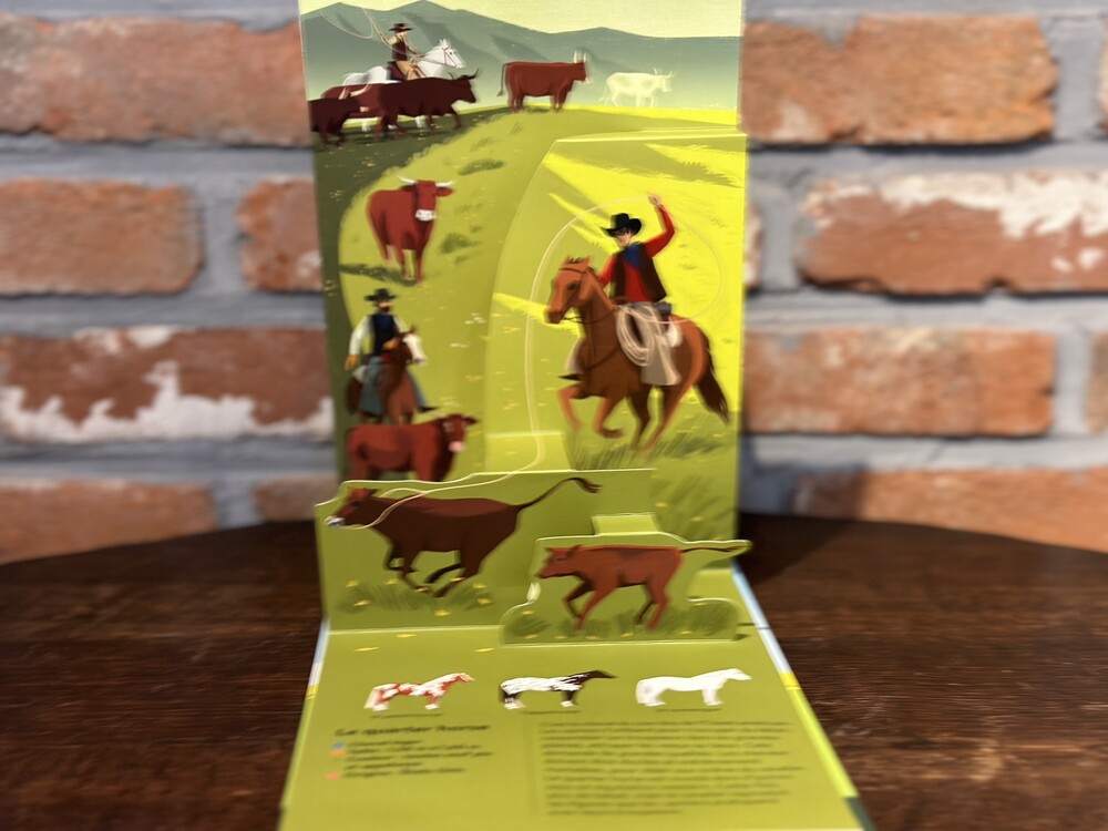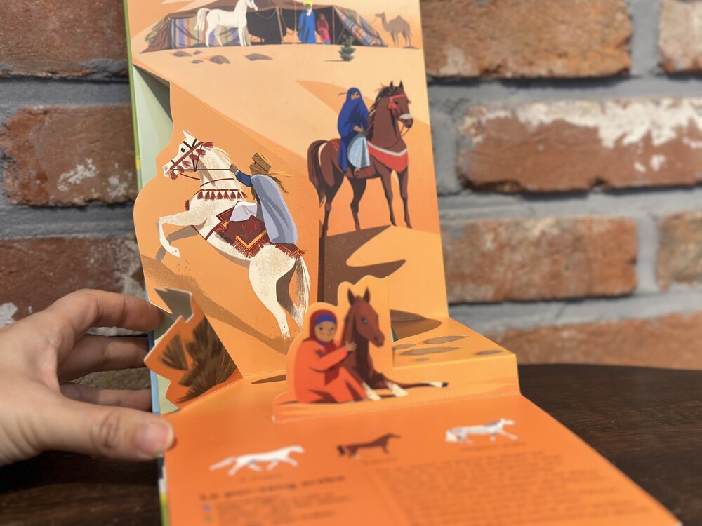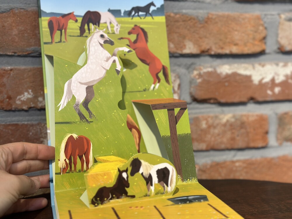 조랑말 클럽부터 경마장까지, 장애물 코스부터 영화 세트장까지, 스피드 트랙에서 서커스 트랙까지, 대회장부터 비행장까지… 많은 조랑말과 말들에 대한 팝업북입니다. 조랑말과 말의 차이점을 정확히 알려주는 첫 팝업 장면 이후 9가지 유형(셰틀랜드, 아랍 순혈, 영국 순혈마, 특출난 말, 해플링거, 스포츠 조랑말, 쿼터 호스, 스페인 순종)의 말들이 차례로 다뤄집니다.