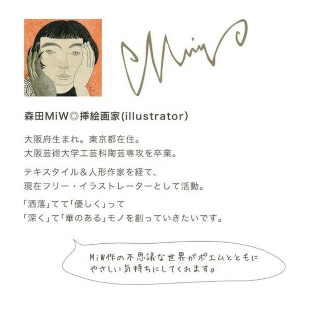 일본 오사카 부 출생의 모리타 미우는 오사카 예술대학 공예과 졸업(도예 전공), 2000년부터 도쿄 거주하며 “세련되고, 다정하고, 깊고, 매력적인 작품”을 모토로 책과 계간지의 표지 그림, 잡지 삽화, 광고 그림, 애니메이션, 가게 로고, 과자 상자 및 과자디자인, 문구 잡화, 텍스타일, 글자 등등을 다양한 기법으로 제작하고 있습니다.