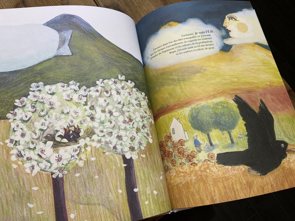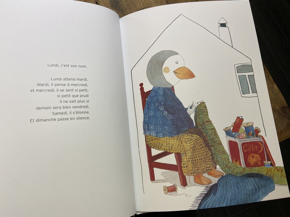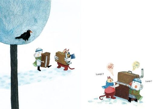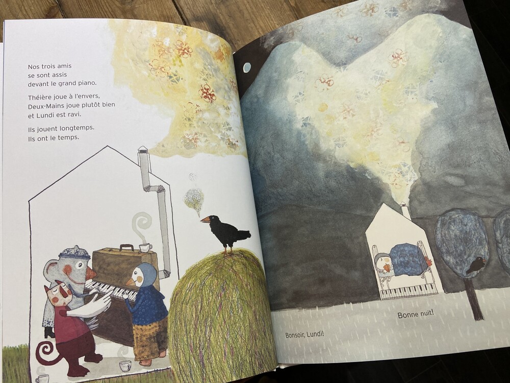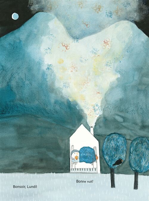 <Lundi> (월요일) 이에요. 월요일이라는 아이가 친구 둘과 함께 있는데 봄, 여름, 가을이 지나고 겨울!!! 폭풍과 추위가집을 휩쓸고 지나간 후 월요일은 서서히 사라지기 시작합니다.