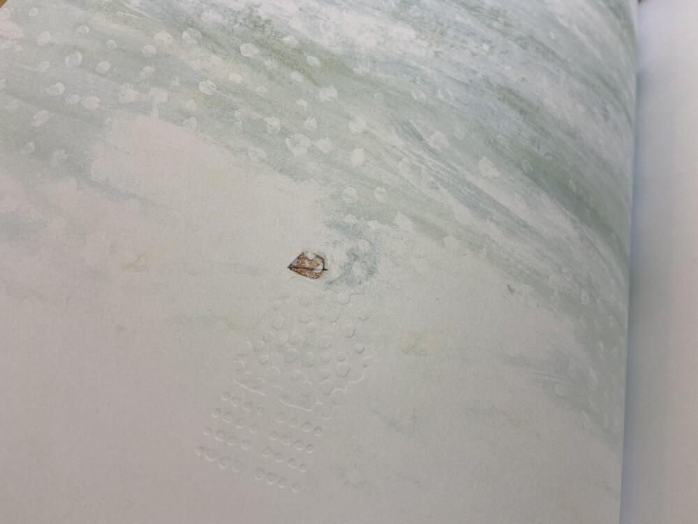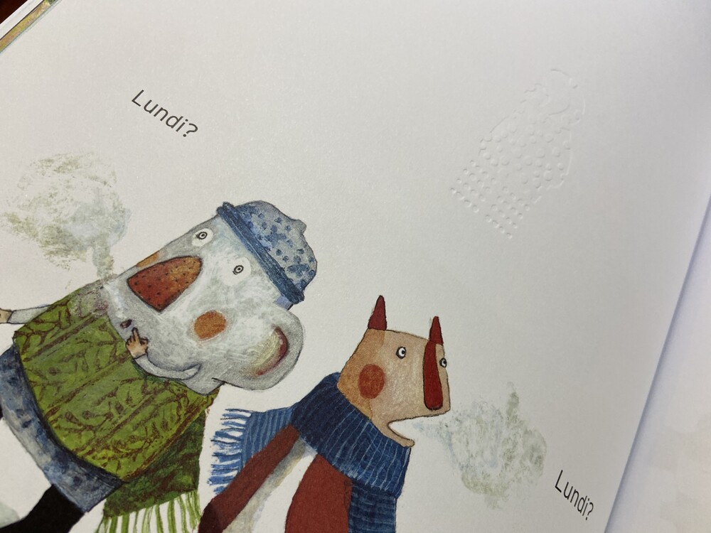 우리는 더 이상 월요일을 볼 수 없지만, 종이에 엠보싱 효과가 되어있어 손으로 만지면 오돌도돌하게 월요일을 느낄 수있어요. 점점 그는 색을 잃어가고, 글자도 없어지고, 점점 책은 촉각으로 만져서 느낄 수 있게 됩니다. 우리는 캐릭터를 잃고 손가락에 책을 잃습니다. 친구들이 사라진 월요일을 찾는데 독자들은 손으로 더듬어 엠보싱으로 된 그를 찾을 수 있어요. 곧 봄이 오면 새로운 월요일이 돌아옵니다. 다음 주 월요일.