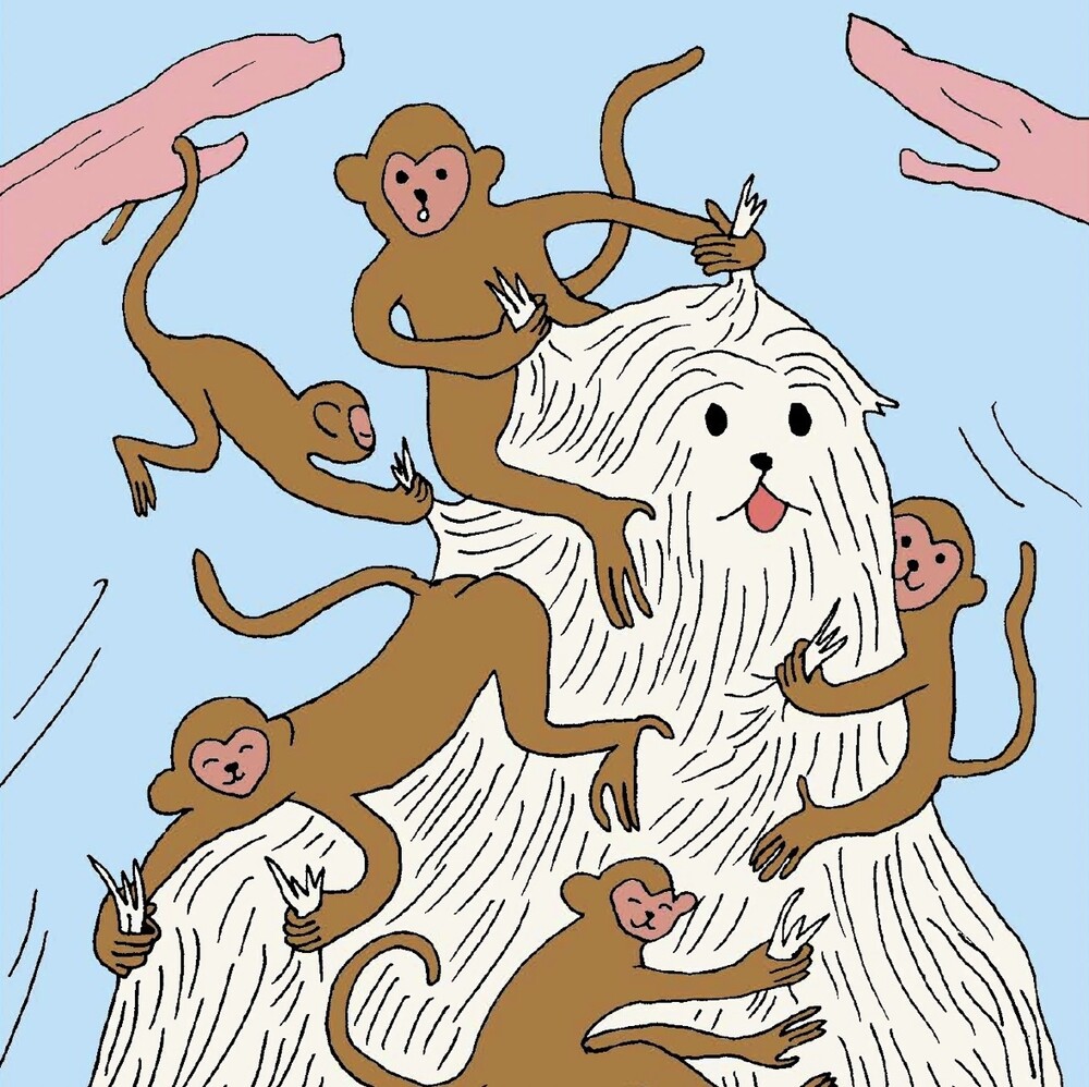 주우는 희희낙락한 표정을 가지고, 긴 흰 털 아래 눈을 가린 괴상한 개입니다.