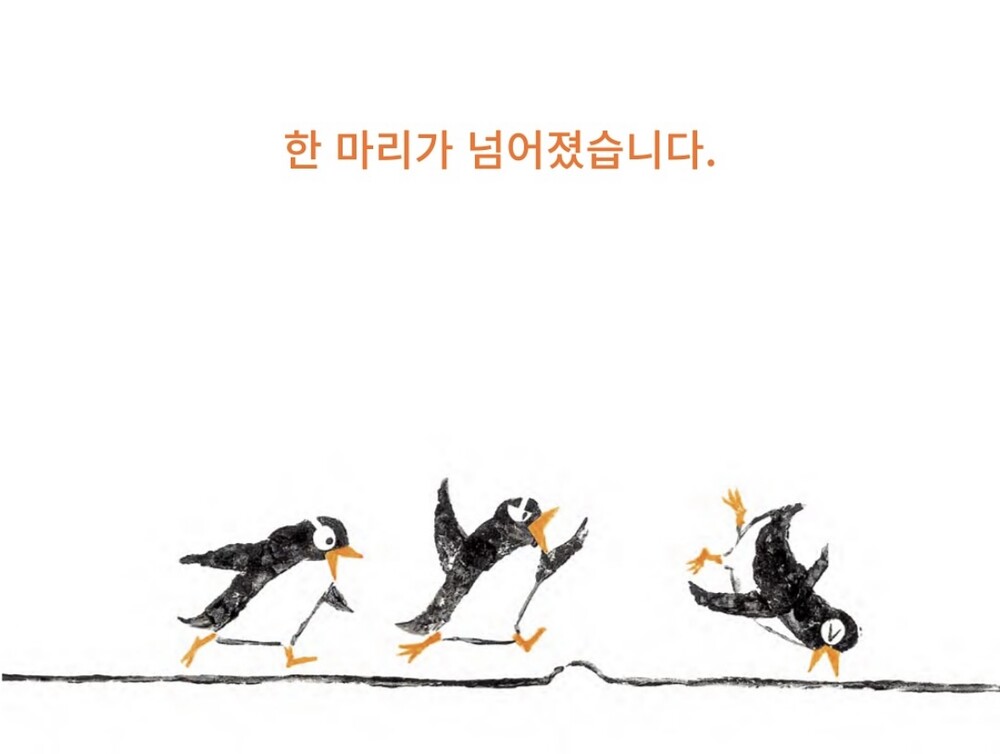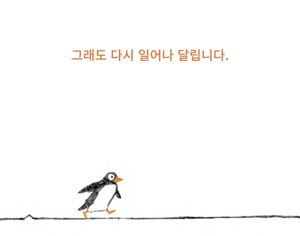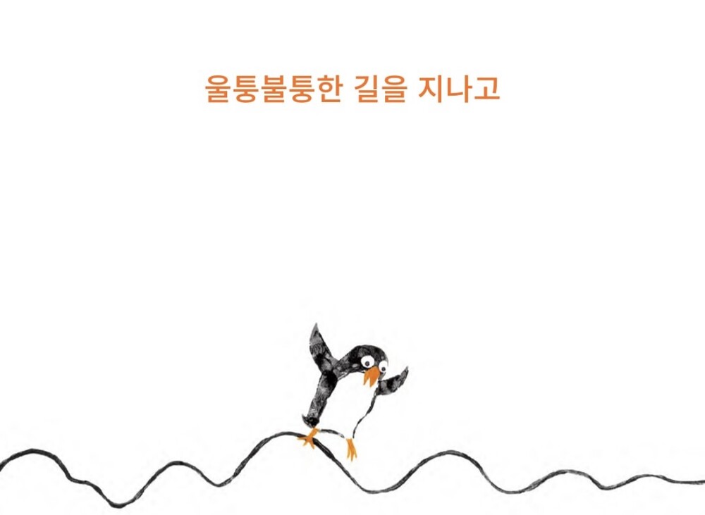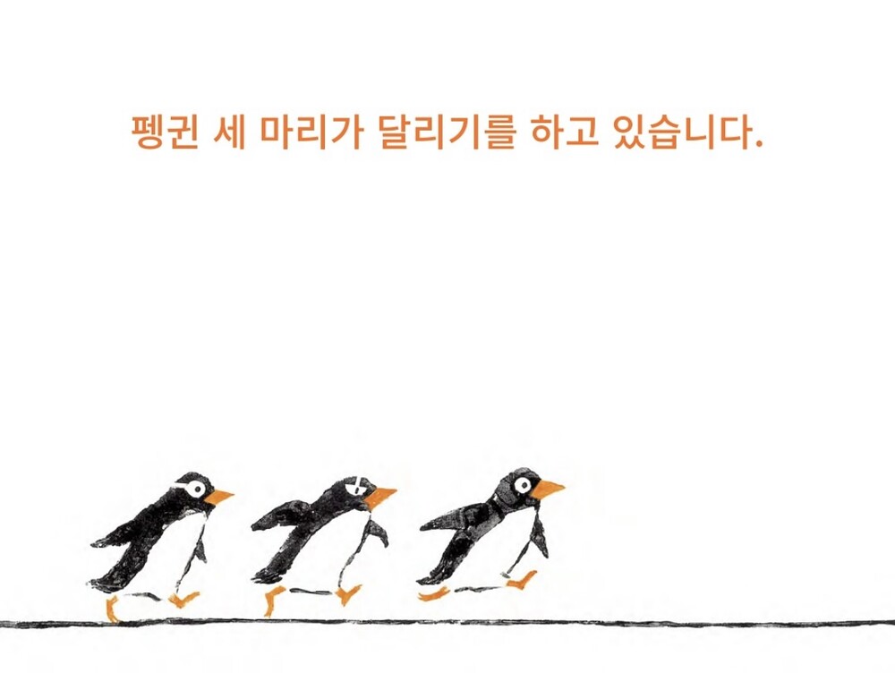 새하얀 바탕에 검은 선으로 이어진 배경, 단순하게 그려진 펭귄들의 모습과 짧은 문장들.