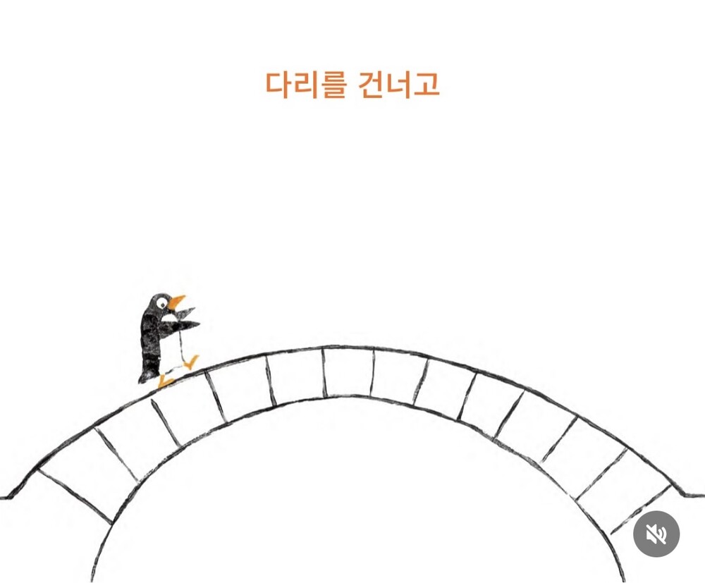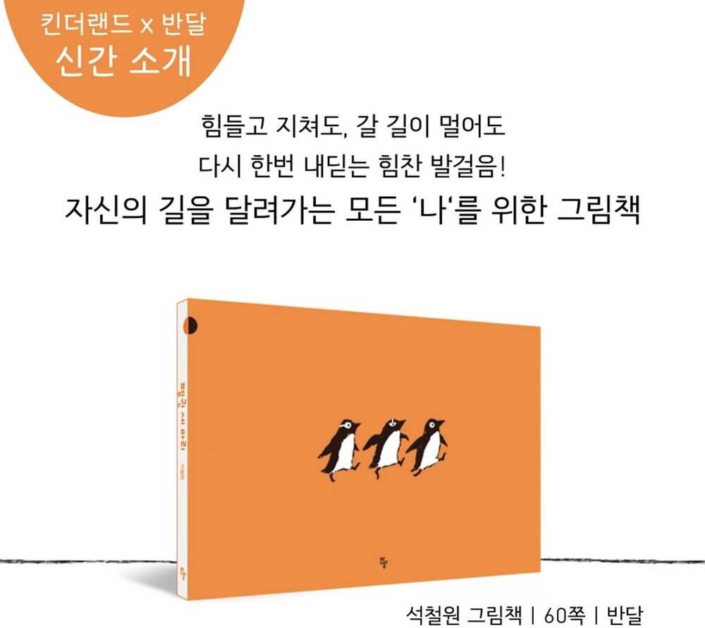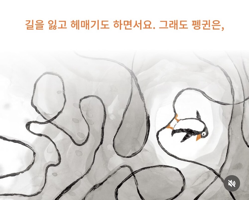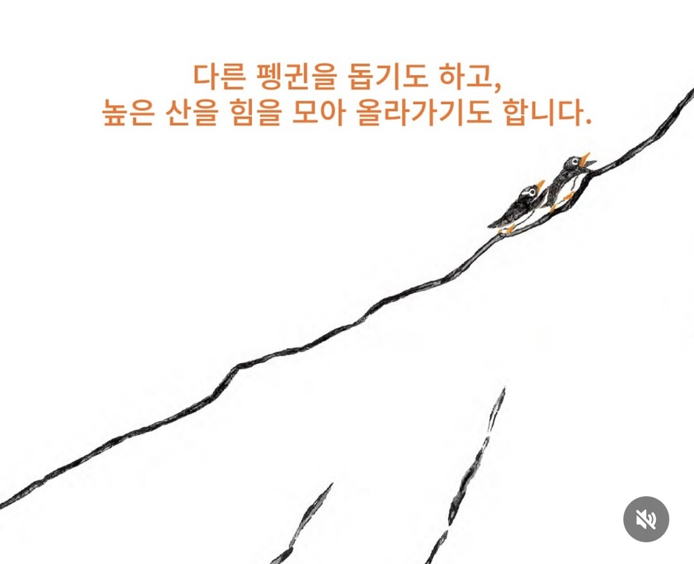 새하얀 바탕에 검은 선으로 이어진 배경, 단순하게 그려진 펭귄들의 모습과 짧은 문장들.