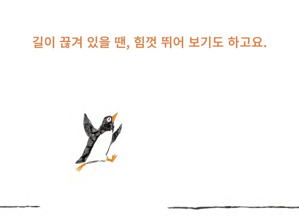 자신이 원하는 길이 어디인지를 곰곰이 생각하는 펭귄처럼, 내가 바라는 길이 무엇인지 가만히 생각해 보세요.