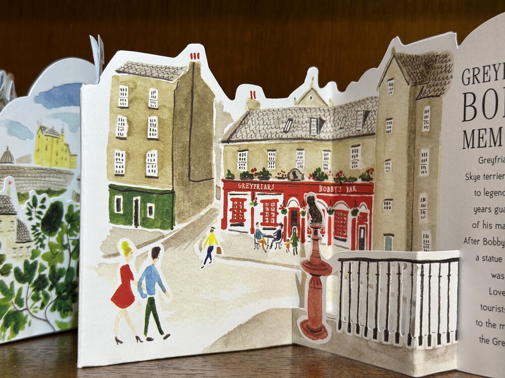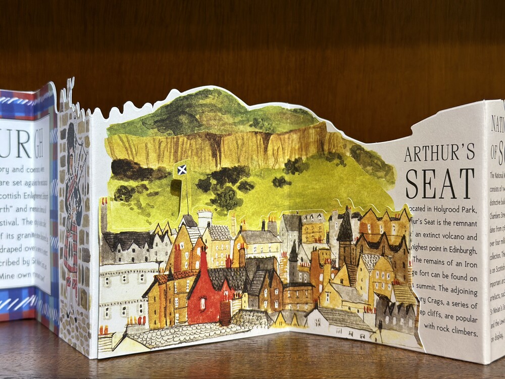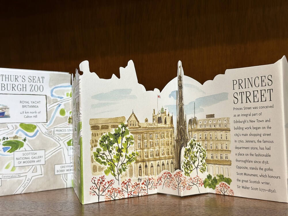아서 시트, 홀리루드하우스 궁전, 스코틀랜드 의회, 로열 요트 브리타니아, 칼튼 힐, 로열 마일, 그레이프리어스 바비, 스코틀랜드 국립 박물관, 스코틀랜드 국립 갤러리, 프린스 스트리트, 에든버러 성, 스코틀랜드 현대 미술 갤러리 등 에든버러에서 가장 유명한 12 명소가 지도와 함께 팝업으로 그려져 있습니다. 한손에 딱 잡히는 앙증맞은 판형으로 앞, 뒤에 다 팝업이 있습니다.