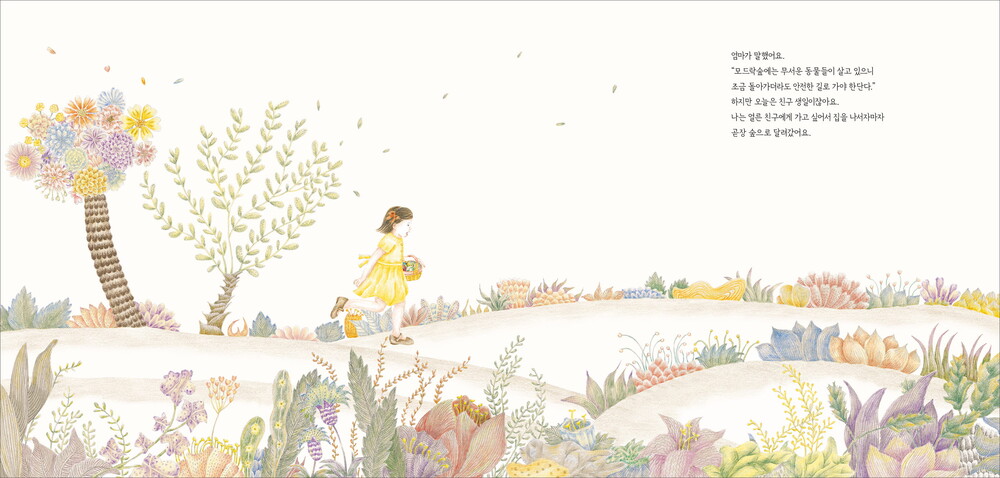 오늘은 친구의 생일입니다. 아이는 친구에게 줄 유리구슬 다섯 개를 선물로 챙겨 길을 나섭니다. 엄마는 모드락숲에는 무서운 동물들이 살고 있으니 조금 돌아가더라도 안전한 길로 가야한다고 말하지만, 길을 나서자마자 아이는 곧장 숲으로 달려갑니다. 친구를 기다리게 하고 싶지 않았으니까요.