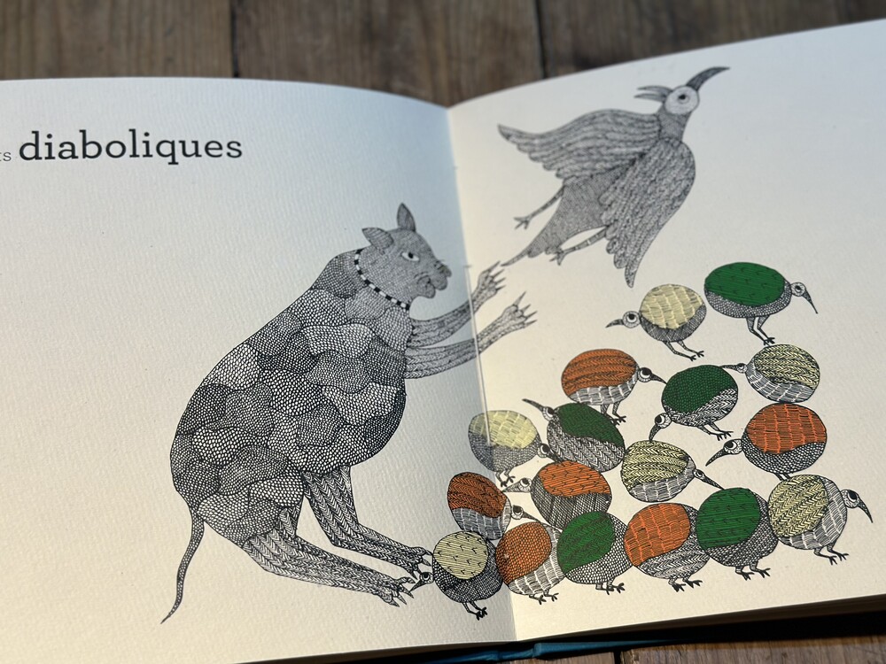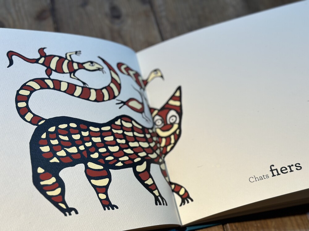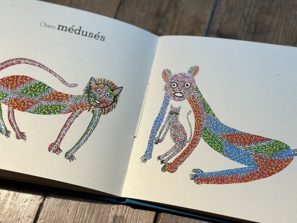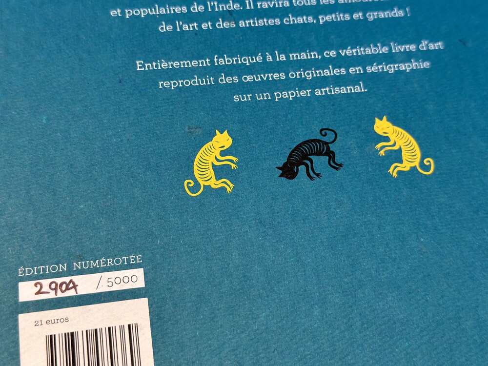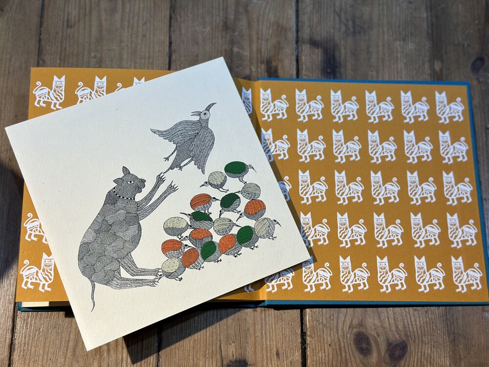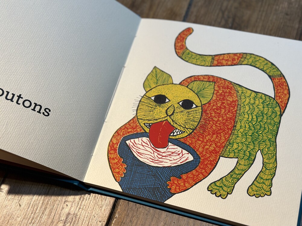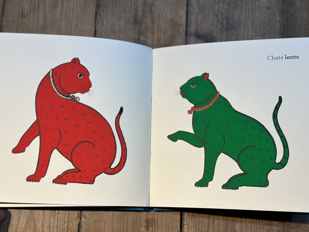 명랑한 고양이, 슬픈 고양이, 느린 고양이, 서두르는 고양이, 수줍은 고양이, 인상을 찌푸리는 고양이... 인도 타라북스 출판사는 한장 한장 손으로 찍어낸 실크스크린 핸드메이드 판화 프린팅입니다. 이 책은 타라북스의 고양이 모음집을 프랑스에서 출간한 작품입니다.