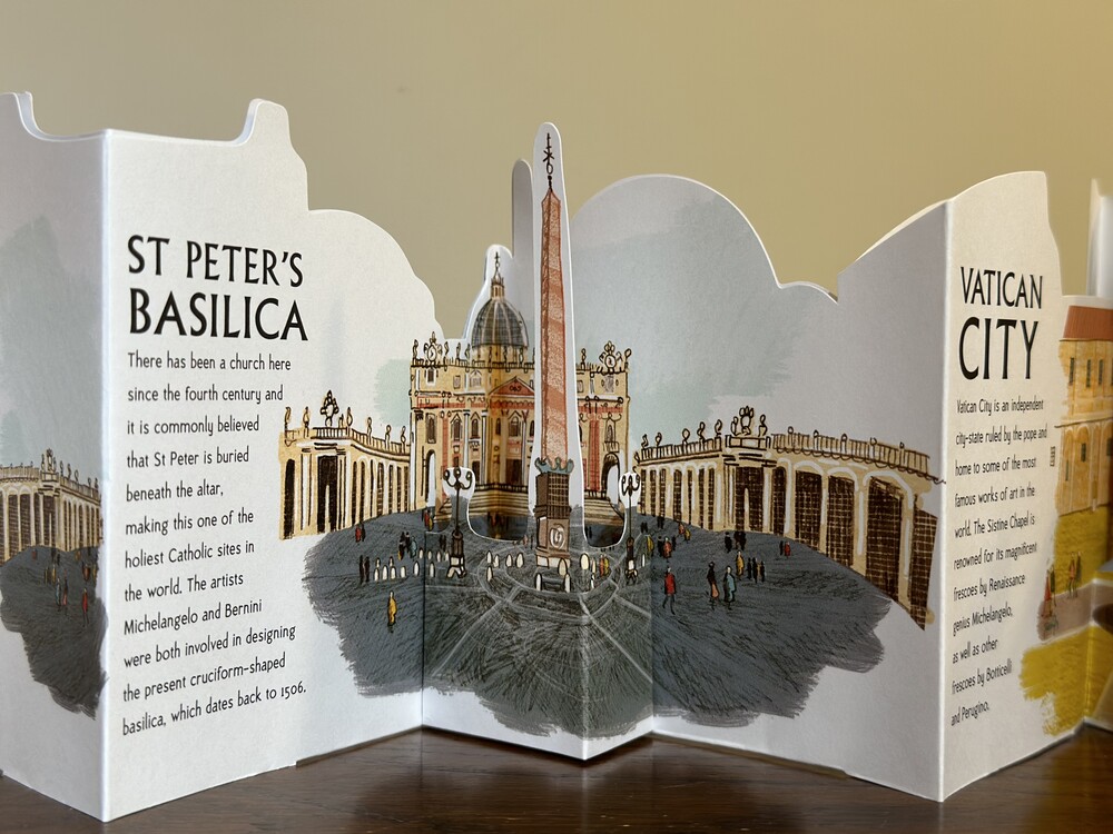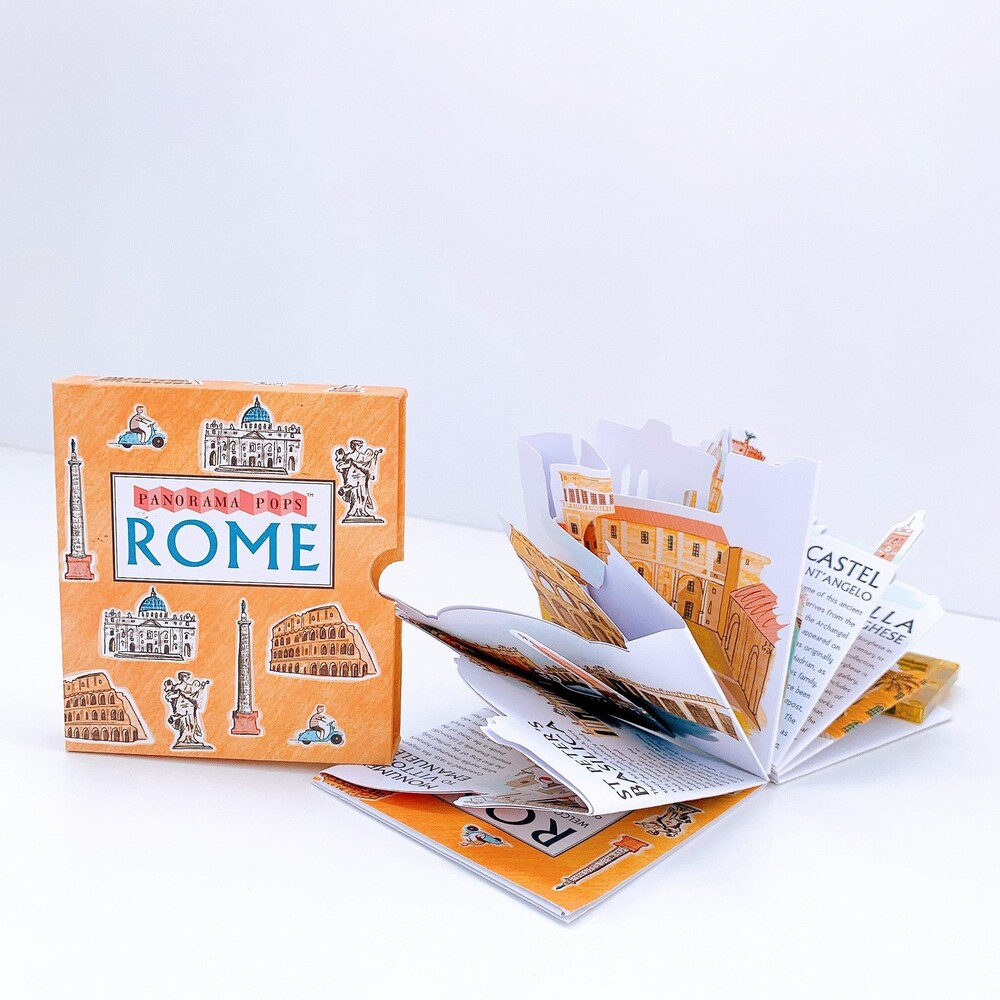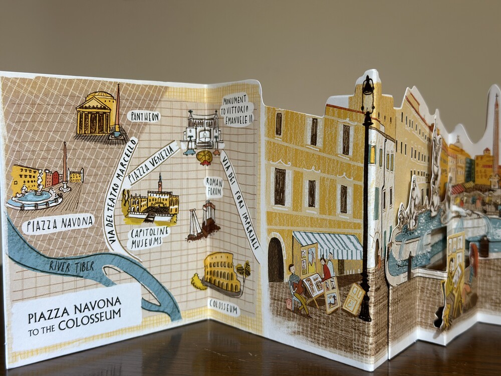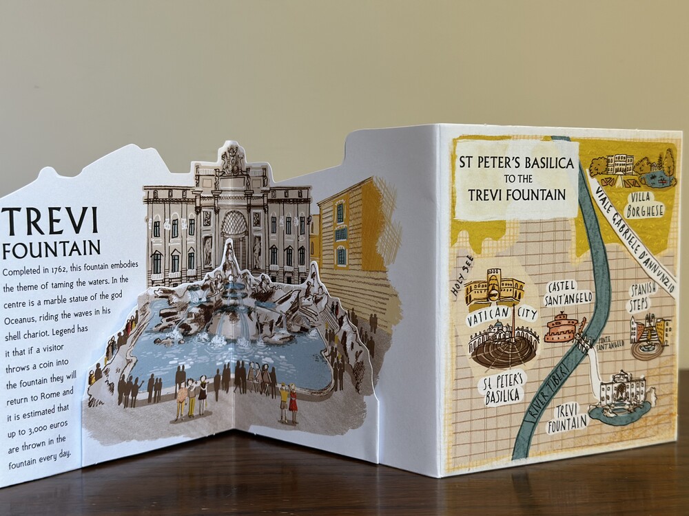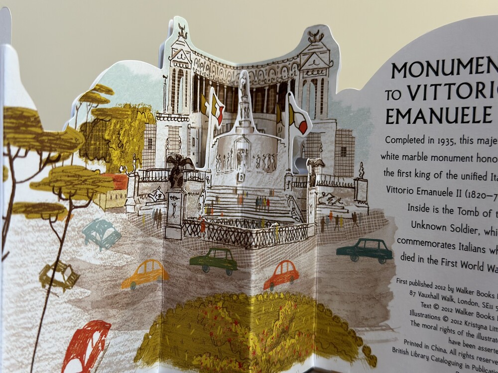 콜로세움, 로마와 제국 포럼, 성 베드로바실리카 바티칸, 트레비 분수, 판테온, 스페인 계단, 성 산트 안젤로, 피아자 나보나, 비토리오 엠마누엘레 II 기념물, 캐피톨 박물관, 빌라 보라 보라 보라, 게즈 정원 등의 로마에서 가장 유명한 12 명소가 지도와 함께 팝업으로 그려져 있습니다. 한손에 딱 잡히는 앙증맞은 판형으로 앞, 뒤에 다 팝업이 있습니다.
