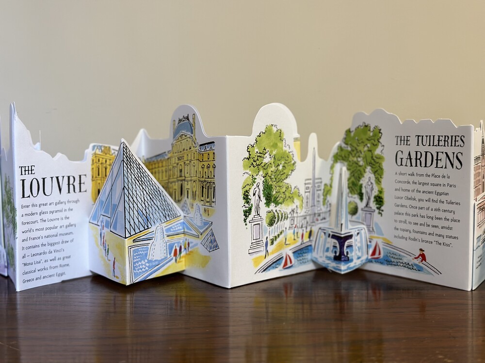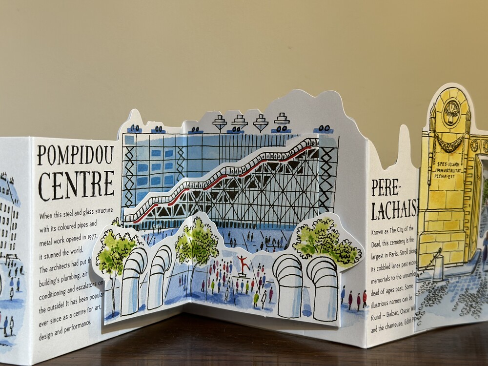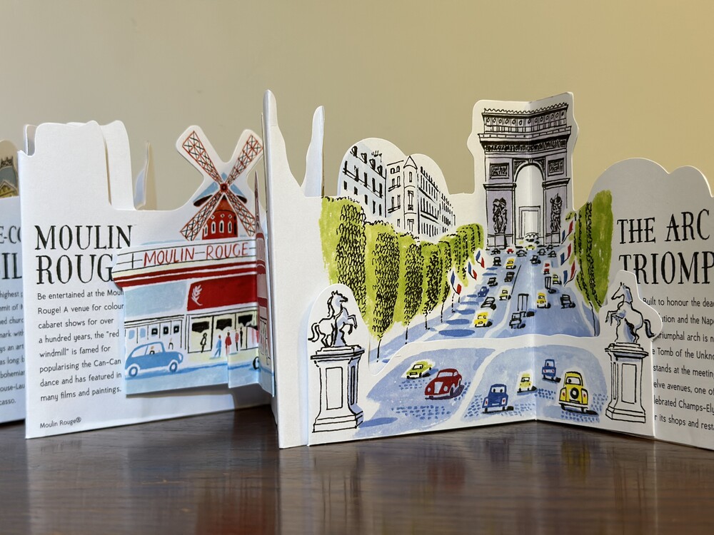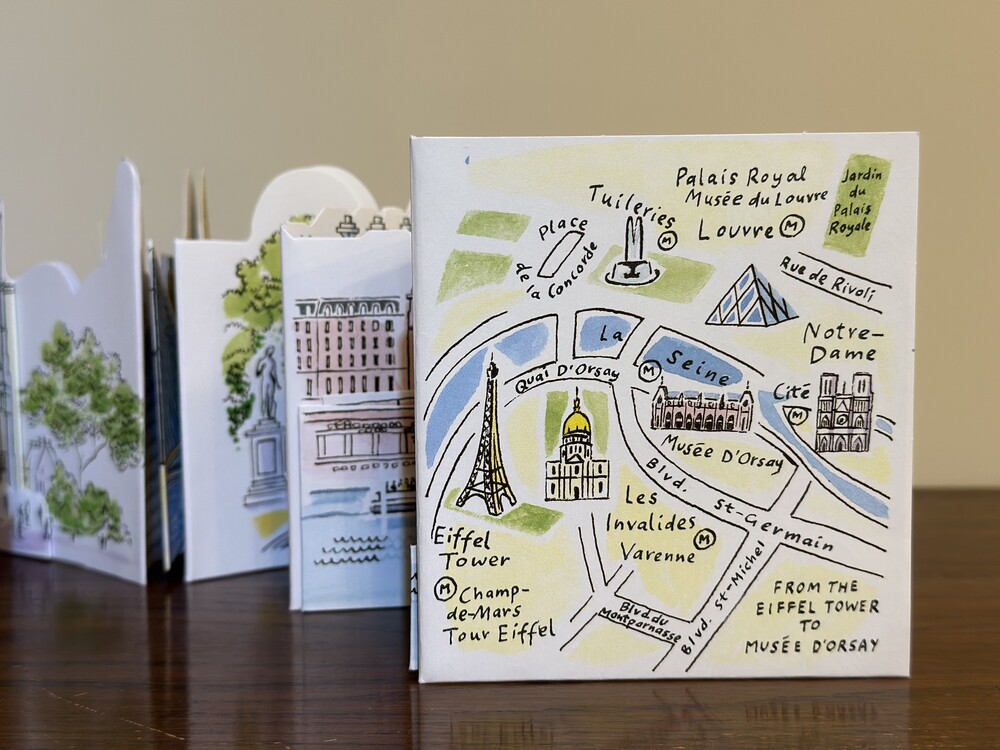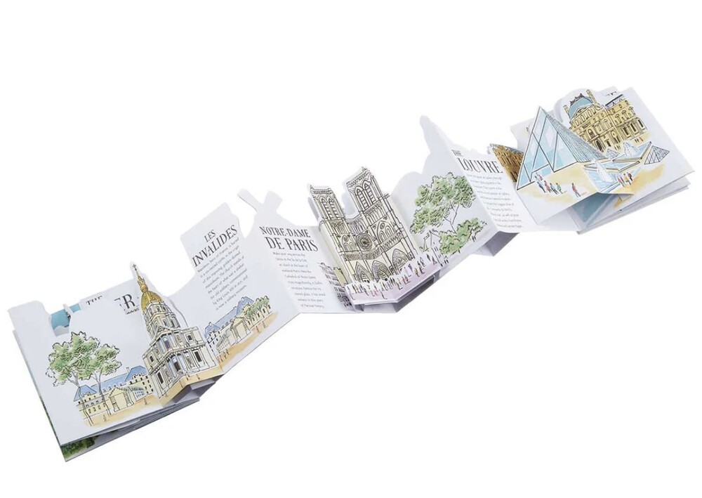 에펠탑, 노트르담드파리, 루브르박물관, 튈르리궁전, 물랑루즈, 개선문, 사크레쾨르사원, 퐁피두센터, 오르세미술관이 지도와 함께 그려져 있습니다. 한손에 딱 잡히는 앙증맞은 판형으로 앞, 뒤에 다 팝업이 있습니다.