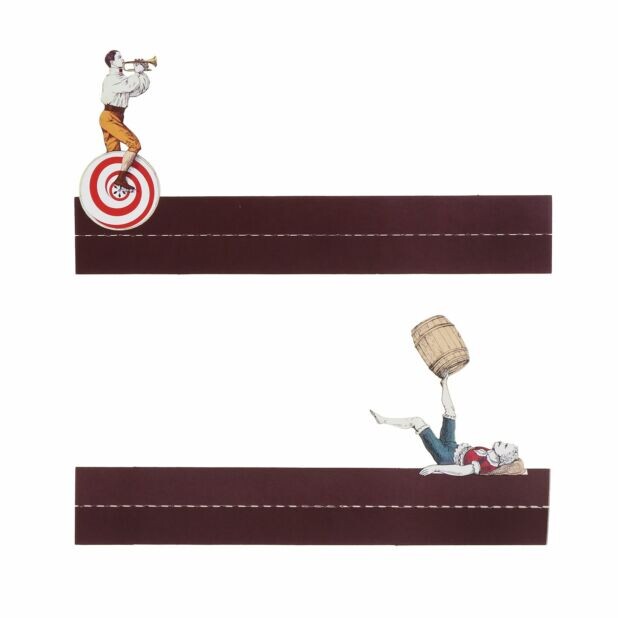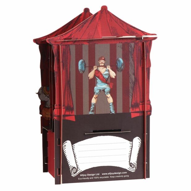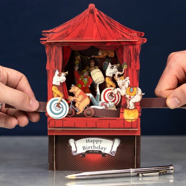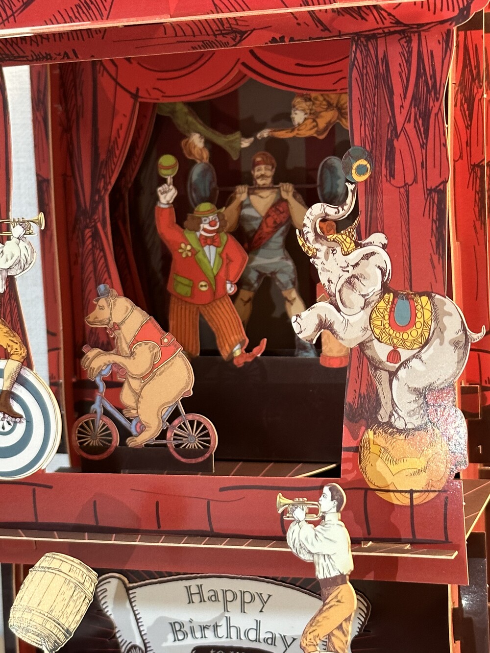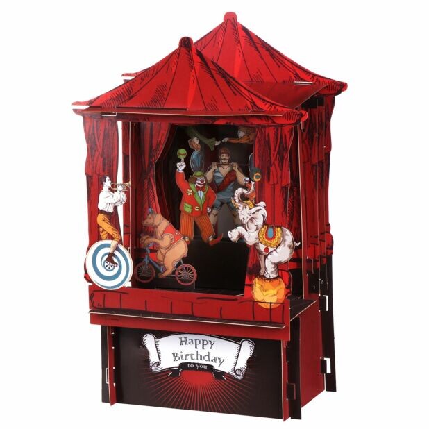 3d 종이 극장 팝업카드 입니다. 서커스 무대에 광대, 헤비급 리프터, 곡예사가 줄무늬 텐트를 배경으로 그네를 타는 모습이 묘사되어 있습니다. 전경에는 외발자전거를 탄 남자와 공 위에서 균형을 잡는 코끼리가 그려져 있습니다. 외발자전거를 탄 남자가 트럼펫을 연주하고 자전거를 탄 곰이 등장하는 서커스 캐릭터 인형 두 개도 따로 포함되어 있습니다.