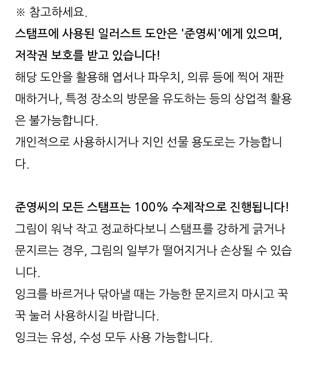 ⁃ 크기(mm): 스탬프(가로/세로 최소20~최대45, 높이 35~45), 찍힌 이미지(가로/세로 최소10~최대 40)