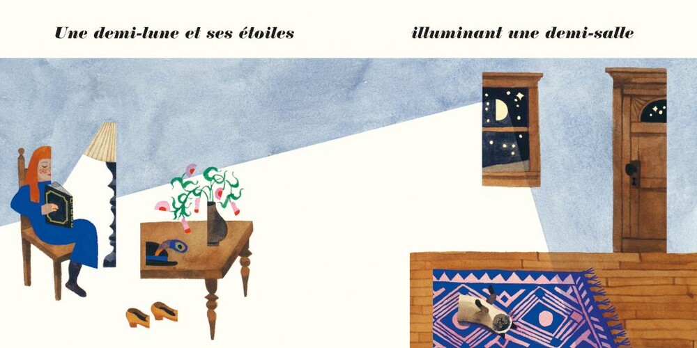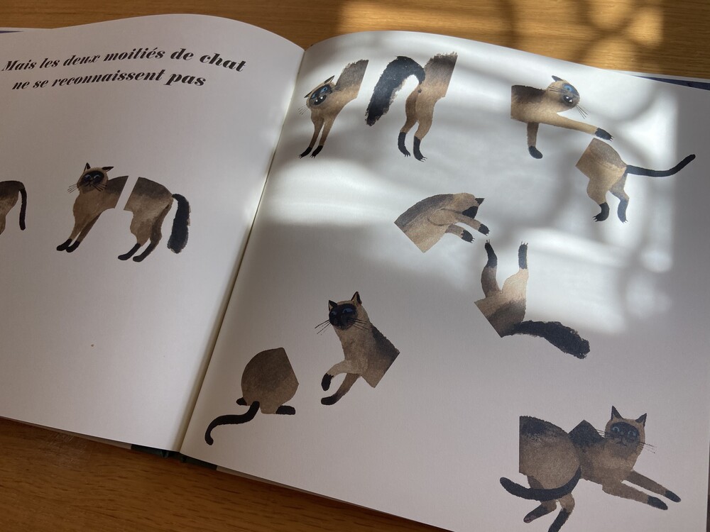 모든 반쪽이 전체를 이루고 있습니다. 반달과 별들의 빛으로 빛나는 매력적인 집에서, 절반의 의자, 절반의 모자, 모카신 한짝이 그들의 반쪽을 찾습니다. 자신의 반쪽을 되찾은 것에 만족해하는 젊은 붉은 머리 여자는 부드러운 달 아래에서 춤을 추러 나갑니다. 그러나 꼬리를 계속 쫓아다니는 이 반쪽 고양이는 무엇을 하고 있을까요? 고양이는 자신이 하나라는 것을 알고 있었을까요?